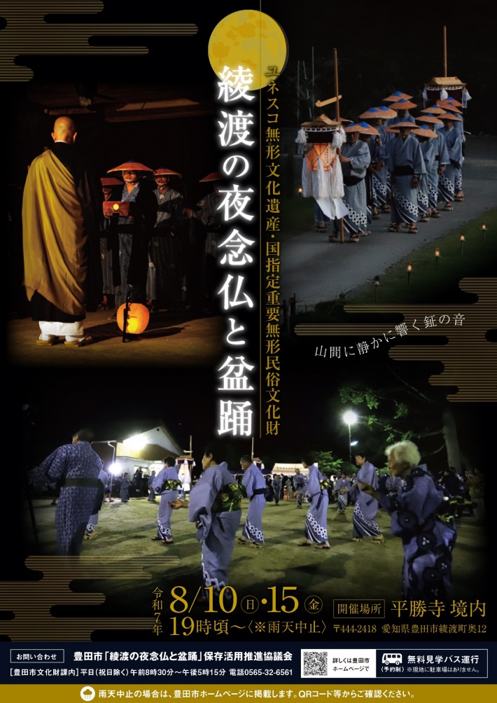 綾渡の盆踊りは楽器を使わず「音頭とり」の唄に合わせて、下駄の足拍子だけで踊る素朴な踊りで、平成9年に国指定の重要無形民俗文化財となり、2022年ラバト(モロッコ)で開催の第17回政府間委員会において、24都府県の41件の「風流踊」が、ユネスコ無形文化遺産として登録され、「綾渡の夜念仏と盆踊り」は豊田市初のユネスコ世界無形文化遺産となりました。