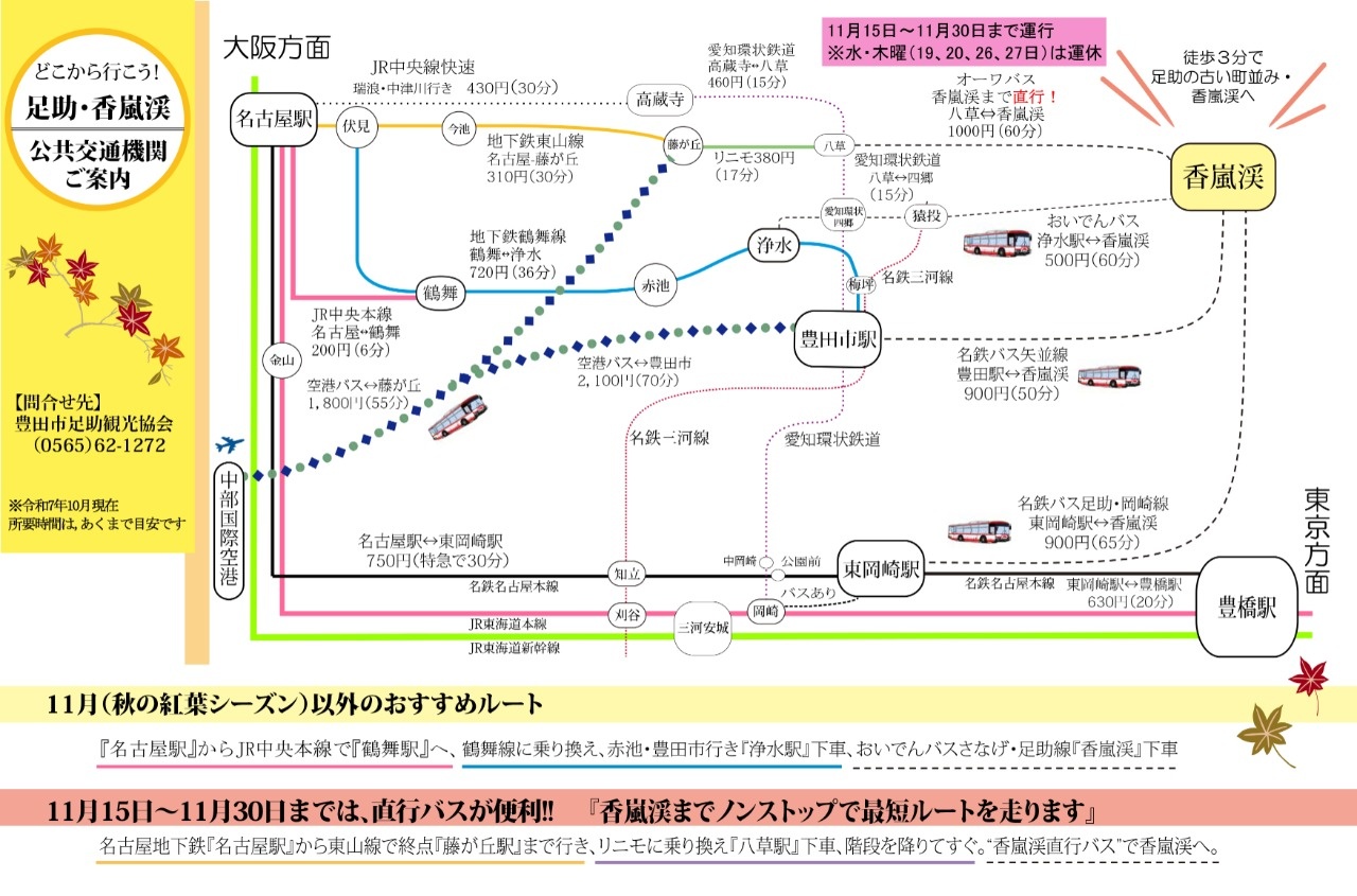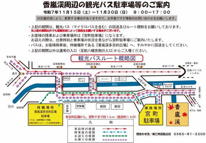 ※混雑が予想される土日祝日は、「近岡上」から153号線を直進し、香嵐渓手前の「足助大橋」止まりとなります。「足助病院」には停まりません。