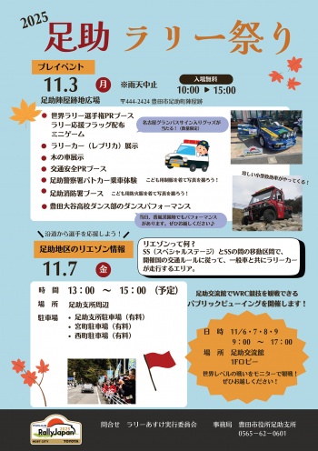 内容:ラリー応援フラッグ配布や、ラリーカーの展示など、さまざまな催しが行われます。