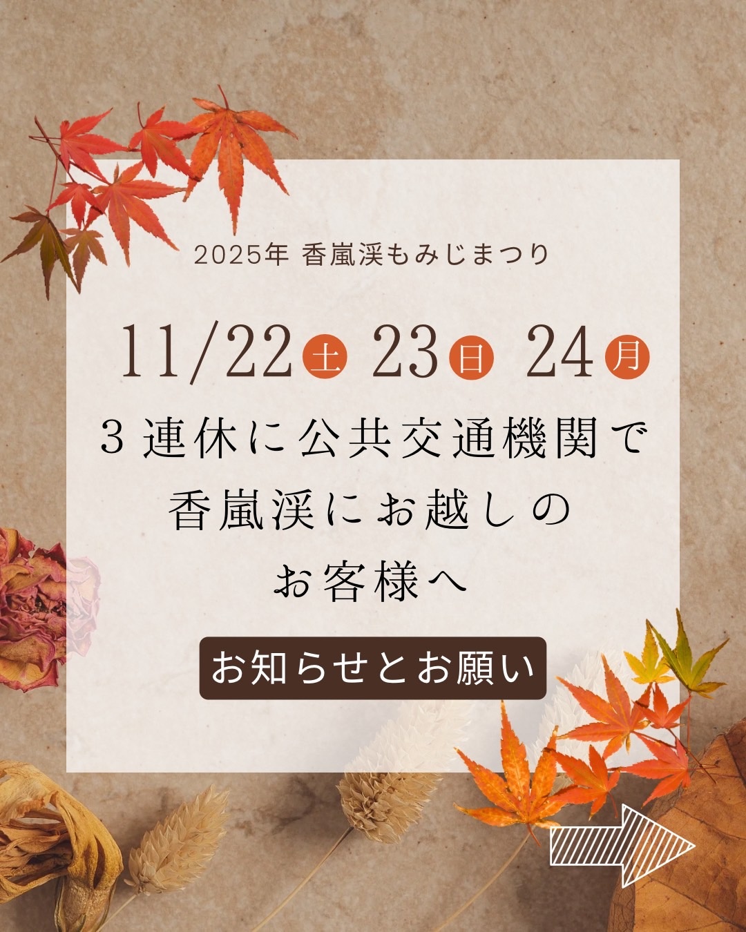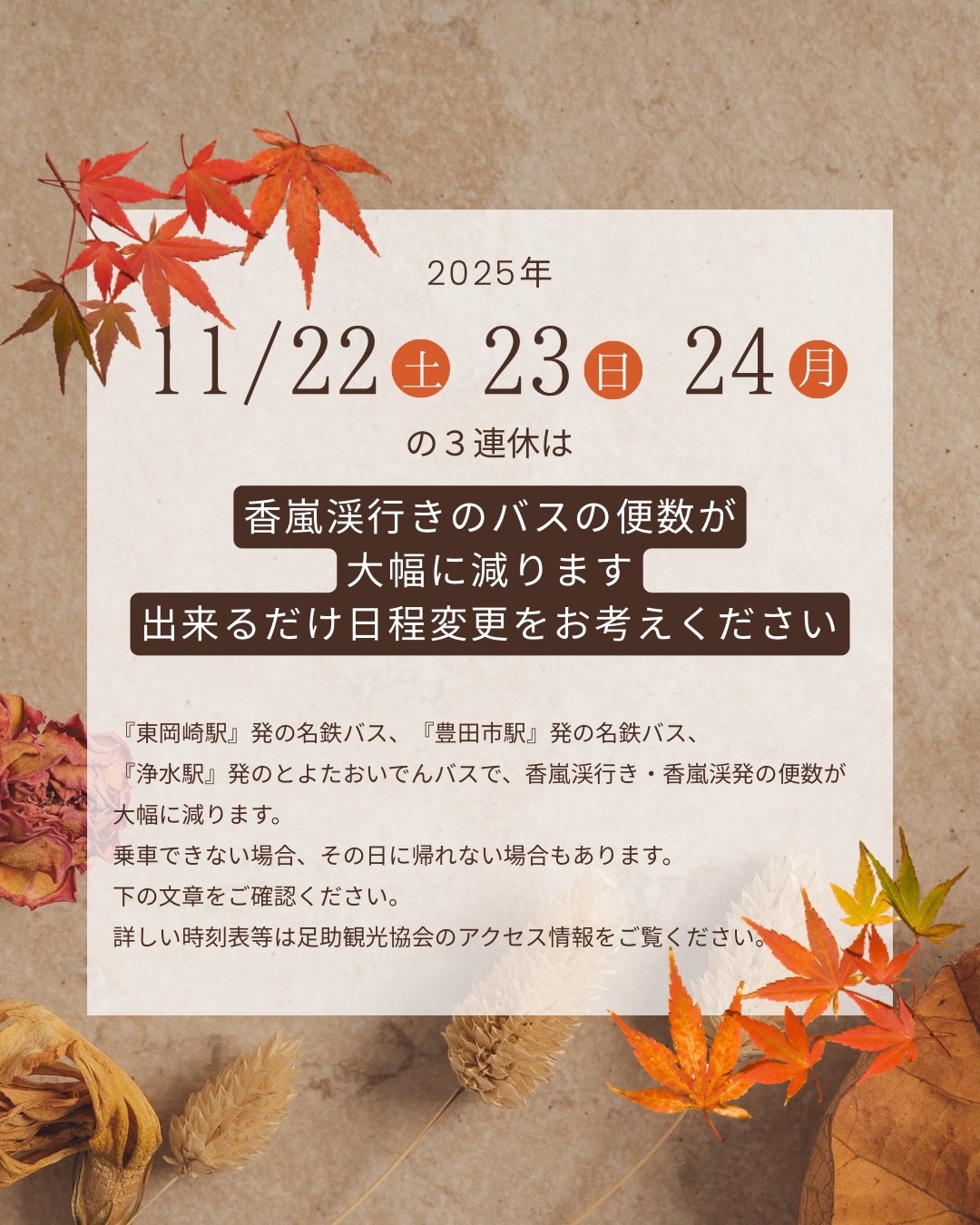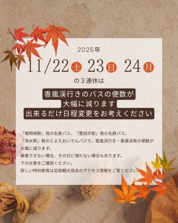 2025年11/22(土)・23(日)・24(月祝)の3連休に公共交通機関で香嵐渓にお越しのお客様へ