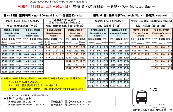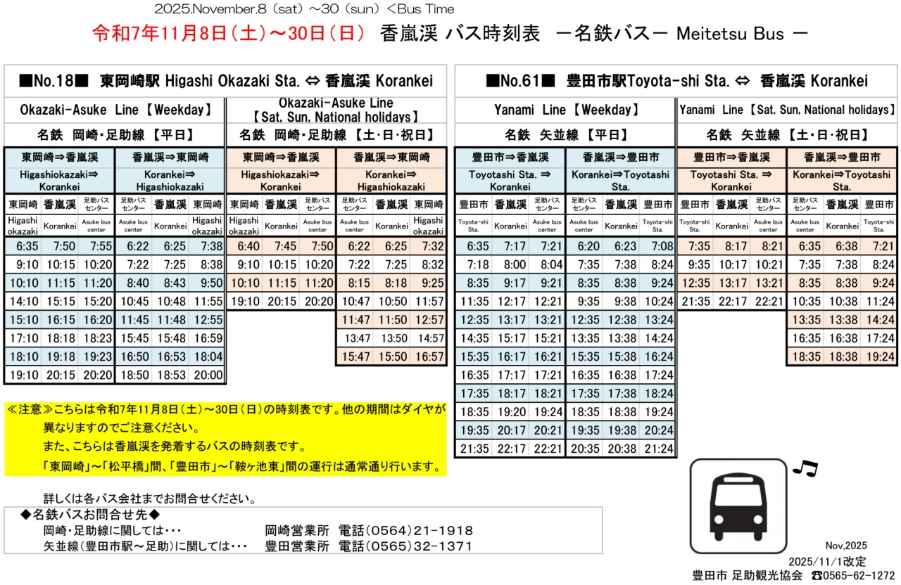 2025年11/30(日)まで、土日祝の香嵐渓から東岡崎駅行きのバスは